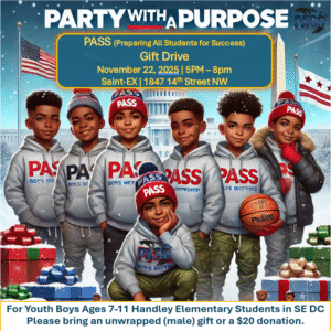 What: An evening of giving and community support. Please bring an unwrapped (male) gift or a $20 donation to help students in Southeast DC.